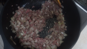 強火にしてひき肉を加え、塩ひとつまみとコショウを加えます。