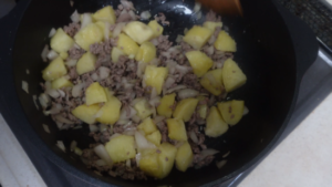 肉の色が変わったらじゃがいもを混ぜます。
