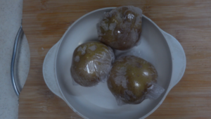 ①ジャガイモは洗って丸ごとラップに包み、600Wの電子レンジに約6分加熱します。