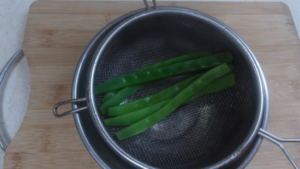 ①さやいんげんはたっぷりの湯で2分間ゆで、ザルにあげます。