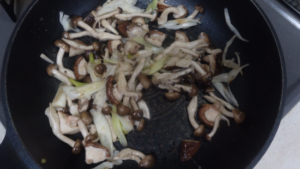 しんなりとしたら、しめじ、しいたけ、塩1つまみを加えて中火で炒めます。