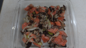 きのこのかさが約半分になったら塩小さじ1/3強、黒こしょう適量を加え、さけと合わせて耐熱皿に広げます。