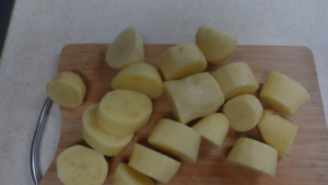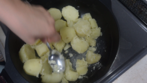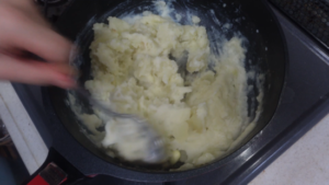 鍋に戻し入れて中火にかけ、スプーンでつぶしながら水けをとばします。