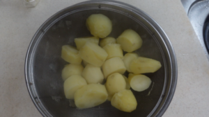 ④じゃがいもがなめらかになったら、耐熱皿にのせて平らにし、ピザ用チーズをのせます。
