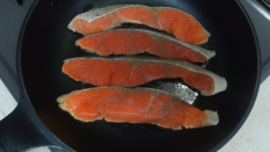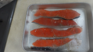 フライパンにサラダ油大さじ1を中火で熱し、さけを並べ入れて焼きます。