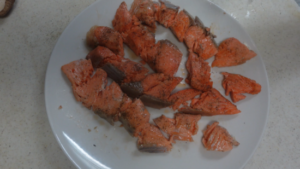 ①さけは水けを拭き、両面に塩小さじ1/2、黒こしょう適量をふります。