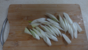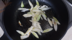 フライパンにサラダ油大さじ1を弱火で熱し、ねぎを4~5分間じっくりと炒めます。