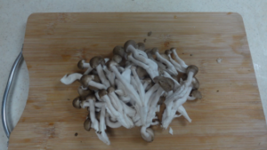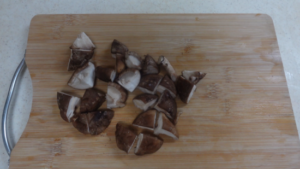 ②ねぎは斜めに1~2cm厚さに切り、しめじは根元を除いて大きめにほぐします。しいたけは石づきを除いて4~6等分に切ります。