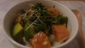 和田明日香さんの「サーモンとアボガド丼」を作りました。サーモンとアボガドは相性ばっちりです。