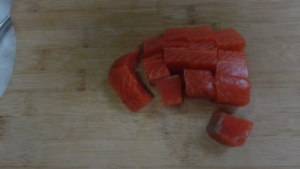 ①サーモンを2cm角くらいに切り、アボガドは3㎝角切りします。