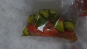 ②サーモン、アボガド、香り醤油だれ保存袋に入れて密封しておきます。