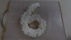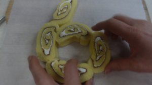 ロールケーキを伸ばし「6」を作ります。伸ばしたロールケーキをくっつけていきます。