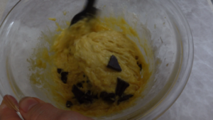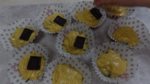④マフィンカップに生地を等分に流し入れ生地にチョコを加えさっくり混ぜます。